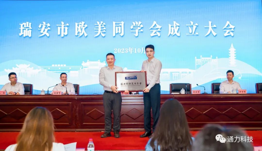 成立大會上,浙江省歐美同學(xué)會專門發(fā)來賀信,市政協(xié)副主席金麗云代表各民主黨派、市工商聯(lián)、無黨派人士、人民團(tuán)體致賀詞。浙江通力傳動科技股份有限公司副總經(jīng)理項純堅當(dāng)選為瑞安市歐美同學(xué)會第一屆理事會會長。會議還舉行了“瑞安市歐美同學(xué)會”授牌和頒發(fā)聘書儀式。