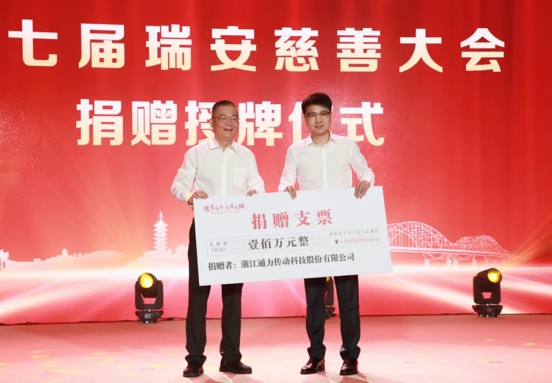 為合力打造共同富裕示范區(qū)縣域標桿,響應瑞安市委市府號召,通力科技總經理項純堅代表通力科技向大會捐贈100萬元。